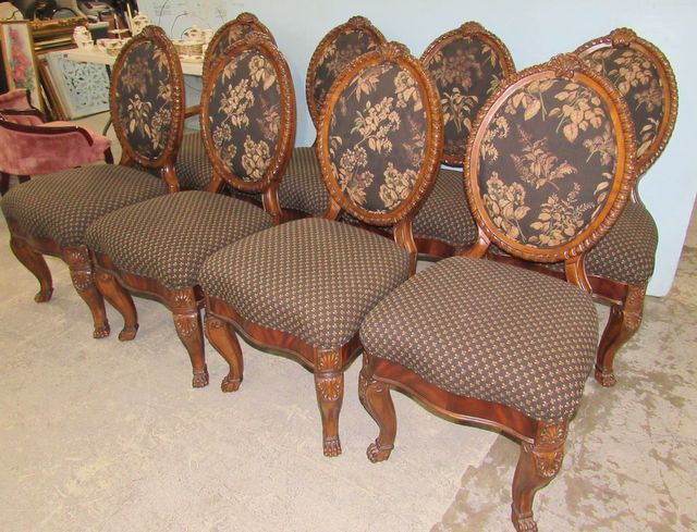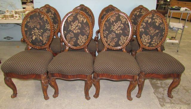 Burl wood design, shell crest and carved border, two arms, six side chairs, upholstered seats, matches lot 696. Burl wood design, shell crest and carved border, two arms, six side chairs, upholstered seats, matches lot 696.
