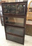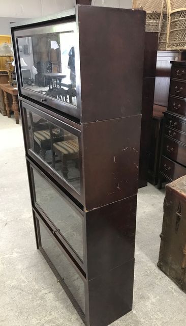 Four shack bookcase with glass doors, stack have pegs, one stack is missing peg, has finish wear, pressed wood, 62"h., 33"w. Four shack bookcase with glass doors, stack have pegs, one stack is missing peg, has finish wear, pressed wood, 62"h., 33"w.