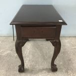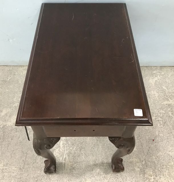 Modern mahogany finish single drawer, ball-n-claw side side, has scratches, pull hardware in drawer, 22"h., 17"w., 27"d. Modern mahogany finish single drawer, ball-n-claw side side, has scratches, pull hardware in drawer, 22"h., 17"w., 27"d.