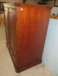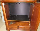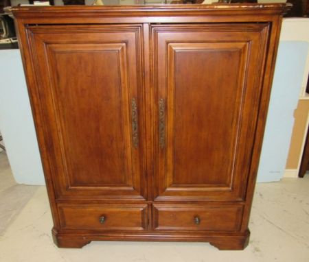 Double door flat screen tv cabinet, two drawers, top border has finish damage, on wheels, 57"h., 52"w., 29"d. Double door flat screen tv cabinet, two drawers, top border has finish damage, on wheels, 57"h., 52"w., 29"d.