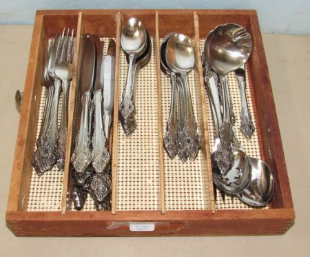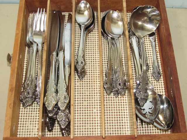 Community stainless, Oneida, 17 spoons, 8 knife, 9 forks, 6 serving pieces. Community stainless, Oneida, 17 spoons, 8 knife, 9 forks, 6 serving pieces.