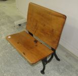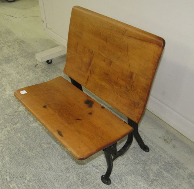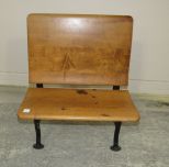 Antique iron frame school desk seat, fold up, 26"h., 20"w. Antique iron frame school desk seat, fold up, 26"h., 20"w.