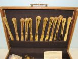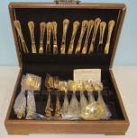 China, WM. Rogers & Son brass plated flatware, 12 place forks, 12 place spoons, 12 tea spoons, 12 knives, serving fork and spoons. Box not included, just for display. China, WM. Rogers & Son brass plated flatware, 12 place forks, 12 place spoons, 12 tea spoons, 12 knives, serving fork and spoons. Box not included, just for display.