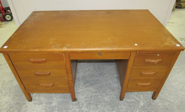 Large oak writing desk, seven drawers, has worn areas on finish, 30"h., 59"w., 34"d. Large oak writing desk, seven drawers, has worn areas on finish, 30"h., 59"w., 34"d.