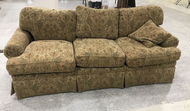 Beige upholstered three cushion sofa, 7"L. Beige upholstered three cushion sofa, 7"L.