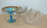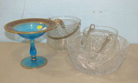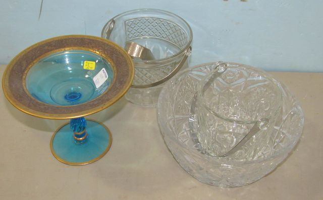 Ice tub with tongs, pressed glass bowl, Aqua gold trimmed compote 6"h. Ice tub with tongs, pressed glass bowl, Aqua gold trimmed compote 6"h.