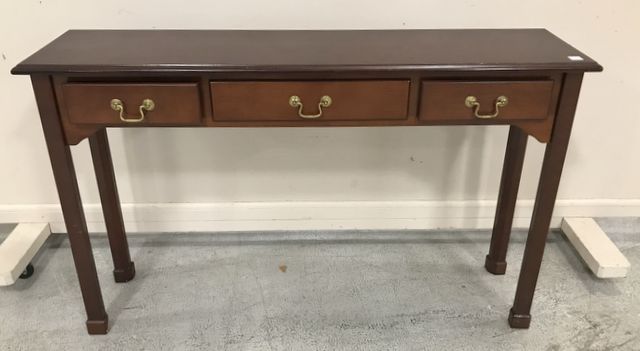 Three drawer sofa table, center pull is in drawer, has finish wear on wood, bolts on legs need tightening, 29"h., 48"w., 12"d. Three drawer sofa table, center pull is in drawer, has finish wear on wood, bolts on legs need tightening, 29"h., 48"w., 12"d.