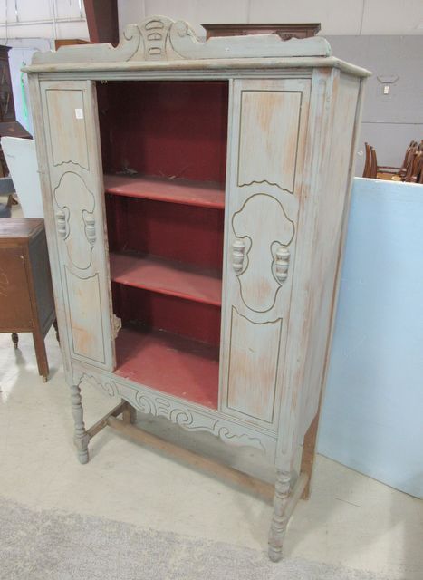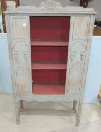 Painted and distressed, door needs repair, no glass, two shelves, needs work, 62"h., 35"w., 14"d.` Painted and distressed, door needs repair, no glass, two shelves, needs work, 62"h., 35"w., 14"d.`