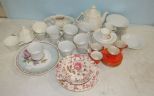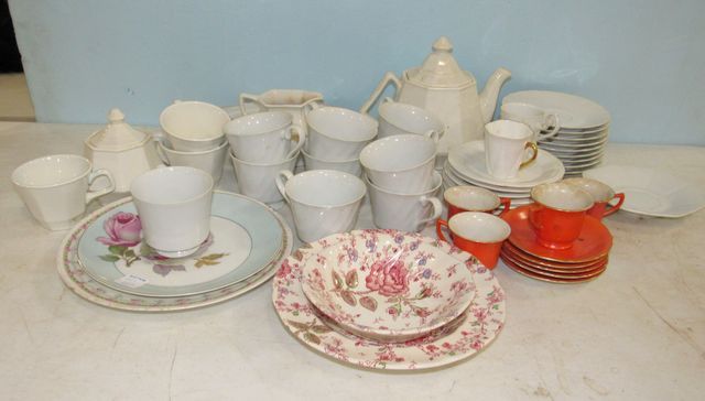 Ceramic tea pitcher, sugar, creamer, plates, Yorkshire cups and saucers, Trico hand painted saucers and cups, Haviland Auclair dish with small chip, Johnson Brothers bowls, Ceramic tea pitcher, sugar, creamer, plates, Yorkshire cups and saucers, Trico hand painted saucers and cups, Haviland Auclair dish with small chip, Johnson Brothers bowls,