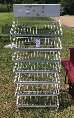 Seven metal shelves with metal name plate top, 57"h., 24"w., 13"d. Seven metal shelves with metal name plate top, 57"h., 24"w., 13"d.