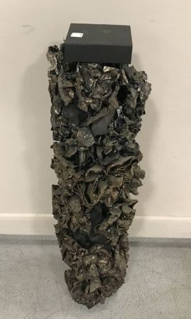 Decorative stand with wrapped floral design decor, wood pedestal, 36"h. Decorative stand with wrapped floral design decor, wood pedestal, 36"h.