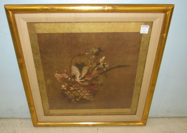 Framed Oriental style still life vase and gold gilt border vinyl, gold gilt frame, 19"h., 19"w. Framed Oriental style still life vase and gold gilt border vinyl, gold gilt frame, 19"h., 19"w.