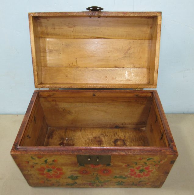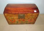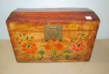 Painted and lacquer trunk with floral artwork, brass latch and handles, 10"h., 18"w., 10"d. Painted and lacquer trunk with floral artwork, brass latch and handles, 10"h., 18"w., 10"d.