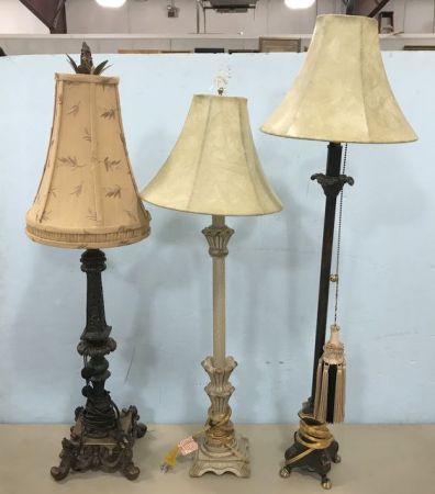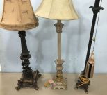White metal age crackle distressed lamp 31"h., Black and gold resin pedestal lamp, and black metal rod lamp with footed base 36"h. White metal age crackle distressed lamp 31"h., Black and gold resin pedestal lamp, and black metal rod lamp with footed base 36"h.