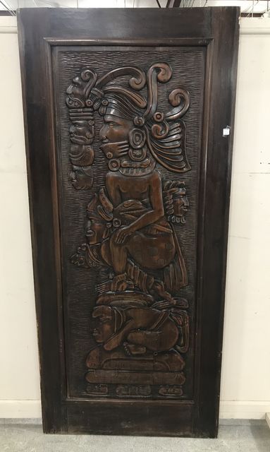Ornate carved Tribal totem pole design large wood panel, same as door size, 80"h., 36"w. Ornate carved Tribal totem pole design large wood panel, same as door size, 80"h., 36"w.