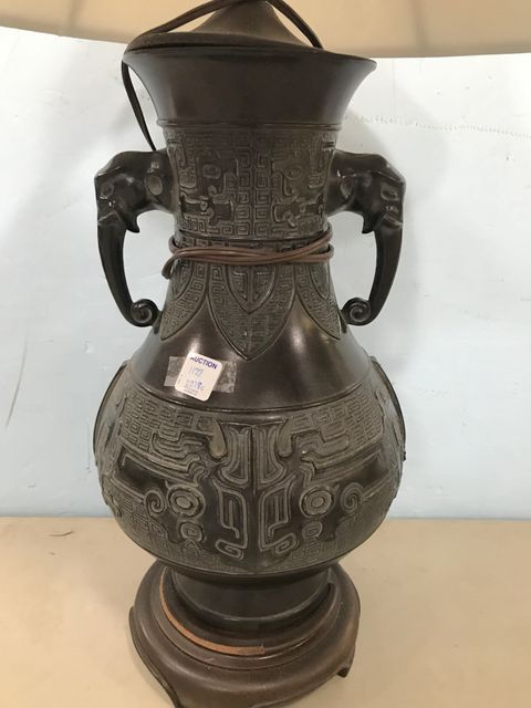 Bronzed color metal elephant urn table lamp with wood base (base has trim missing), 32"h. Bronzed color metal elephant urn table lamp with wood base (base has trim missing), 32"h.