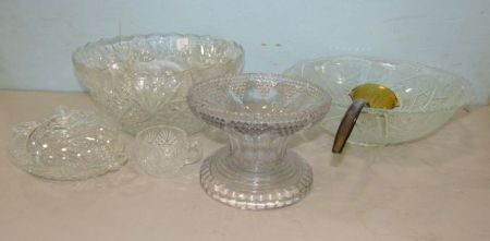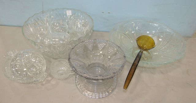 Pressed glass punch bowl and cups, glass pedestal, pressed glass bowl, dish. Pressed glass punch bowl and cups, glass pedestal, pressed glass bowl, dish.