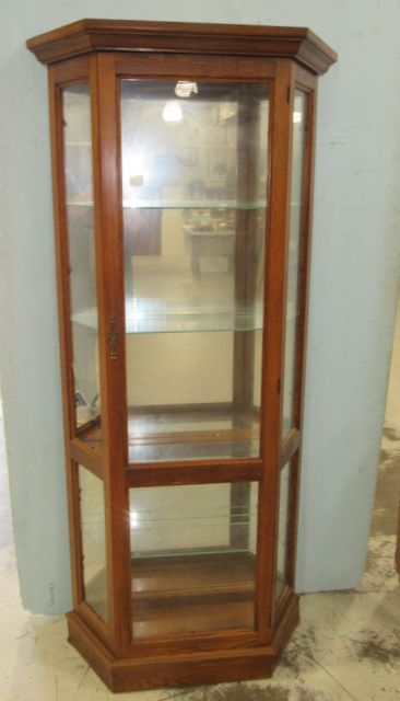 Curio glass door and panel curio, one glass panel is damaged, double door, glass shelves, lighted, 71"h., 31"w., 11"d. Curio glass door and panel curio, one glass panel is damaged, double door, glass shelves, lighted, 71"h., 31"w., 11"d.