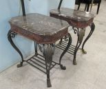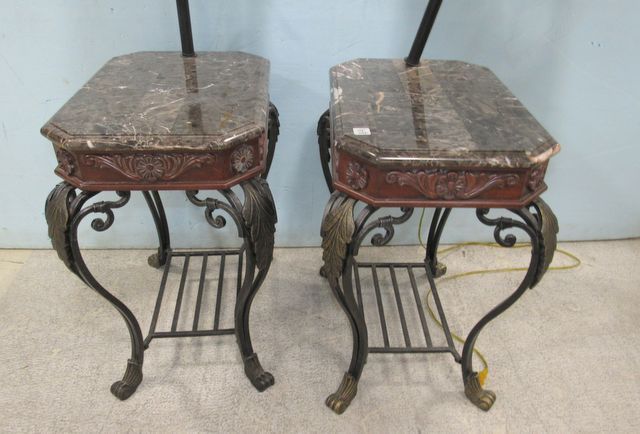 Metal and faux marble top lamp tables, one lamp rod needs repair, 22"h., 20"w., 14"d. Metal and faux marble top lamp tables, one lamp rod needs repair, 22"h., 20"w., 14"d.