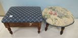 Wood rectangle stool with upholstered top, 9"h., 16"w., and round cushion top stool with wood legs, 8"h., 16"dia. Wood rectangle stool with upholstered top, 9"h., 16"w., and round cushion top stool with wood legs, 8"h., 16"dia.