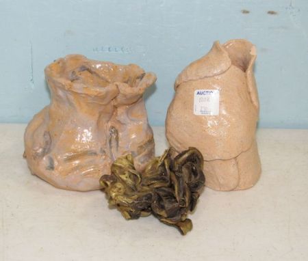 Two hand made pottery vase and decor, largest vase 5"h., 5"w. Two hand made pottery vase and decor, largest vase 5"h., 5"w.