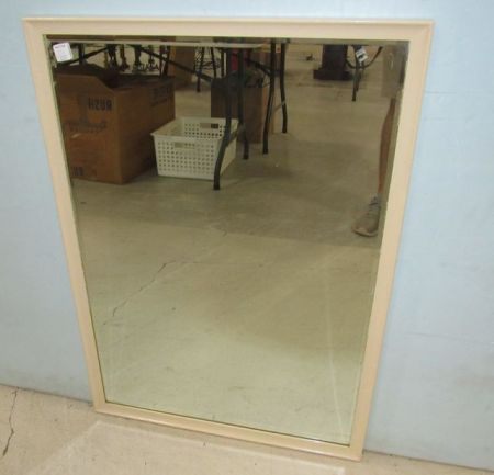 White framed bevel wall mirror, 34"h., 24"w. White framed bevel wall mirror, 34"h., 24"w.