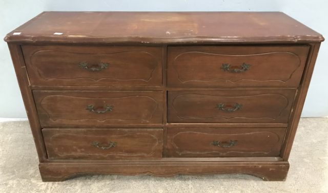 French Provincial style 6 drawer double dresser, has condition issues, drawers and finish need work, 30"h., 50"w., 18"d. French Provincial style 6 drawer double dresser, has condition issues, drawers and finish need work, 30"h., 50"w., 18"d.