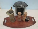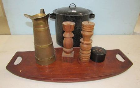 Wood Serving handled tray 27"h., India Brass Pitcher, two wood candle holders, case on coasters, speckled cooking pot with lid. Wood Serving handled tray 27"h., India Brass Pitcher, two wood candle holders, case on coasters, speckled cooking pot with lid.