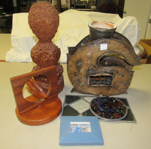 Unique shaped pottery urn (has repaired chip on foot), wood carved bust figure 16"h., two small stain glass panels, wood swivel fish decor, small framed painting. Unique shaped pottery urn (has repaired chip on foot), wood carved bust figure 16"h., two small stain glass panels, wood swivel fish decor, small framed painting.