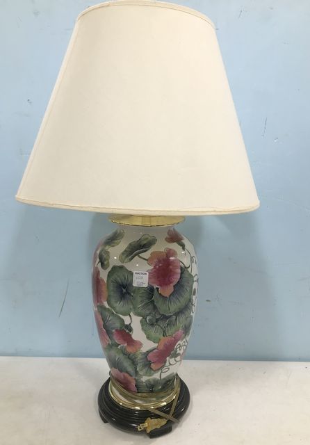 Modern hand painted floral ceramic vase lamp with wood base, 30"h. Modern hand painted floral ceramic vase lamp with wood base, 30"h.