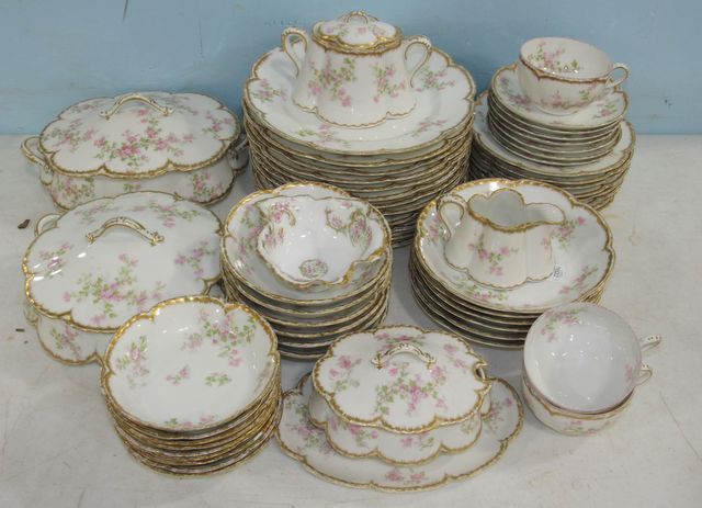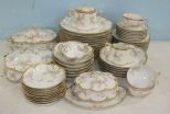 Twelve dinner plate (one has chip), two covered dishes, six salad bowls, eight dessert plates, sugar, creamer, three cups, seven saucers, six bowls. Twelve dinner plate (one has chip), two covered dishes, six salad bowls, eight dessert plates, sugar, creamer, three cups, seven saucers, six bowls.