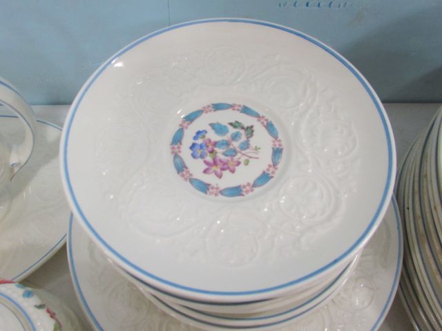 Eleven dinner plates (one has small chip), six salad plates (one has small chip), ten sacuers, three cups, creamer, sugar, gravy boat, four soap bowls. Eleven dinner plates (one has small chip), six salad plates (one has small chip), ten sacuers, three cups, creamer, sugar, gravy boat, four soap bowls.