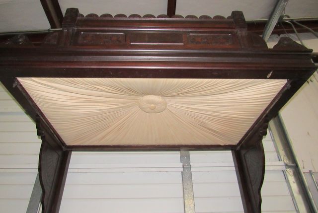 Carved, fabric canopy insert, walnut, sturdy, has some wear on headboard, bought in New Orleans, 9' 8" tall, 56"w. Carved, fabric canopy insert, walnut, sturdy, has some wear on headboard, bought in New Orleans, 9' 8" tall, 56"w.