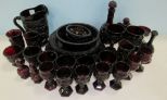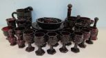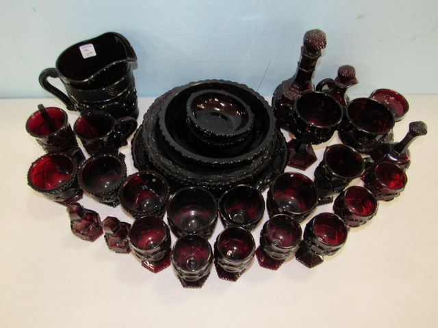 Ruby, seven wine glasses, pitcher, decanter, five sugar bowls, bell, candle stand, salt & pepper, two wine glasses, three bowls, five under plates. Ruby, seven wine glasses, pitcher, decanter, five sugar bowls, bell, candle stand, salt & pepper, two wine glasses, three bowls, five under plates.