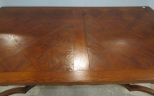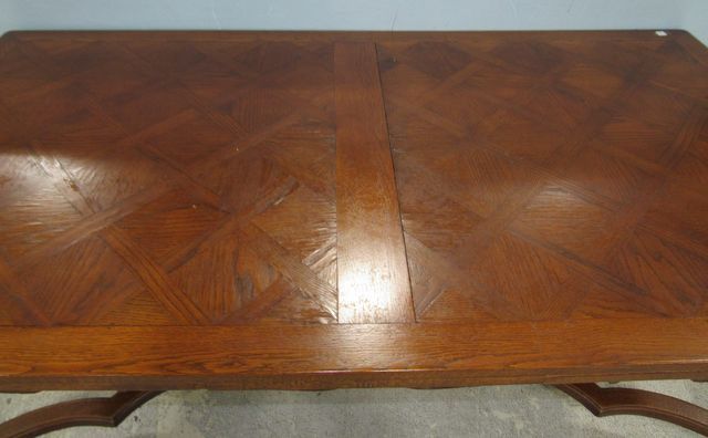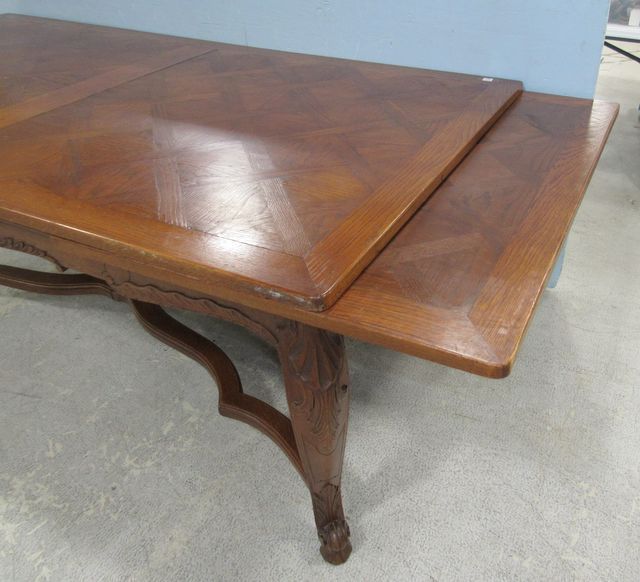 Parquet top, extendable leaves, stretcher, carved legs and base, some blemishes, veneer splits in spots, 30"h., 82"w. Parquet top, extendable leaves, stretcher, carved legs and base, some blemishes, veneer splits in spots, 30"h., 82"w.