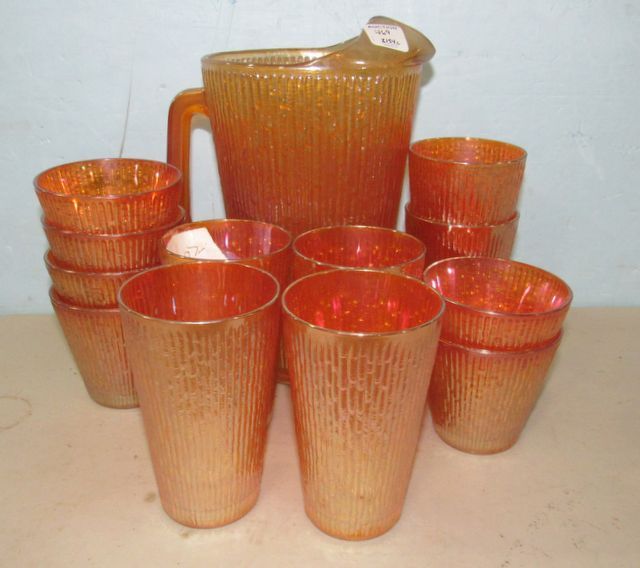 Water pitcher 9"h., six tumblers, six cups. Water pitcher 9"h., six tumblers, six cups.