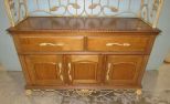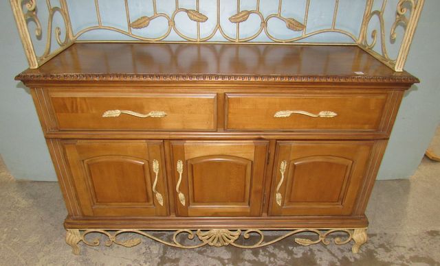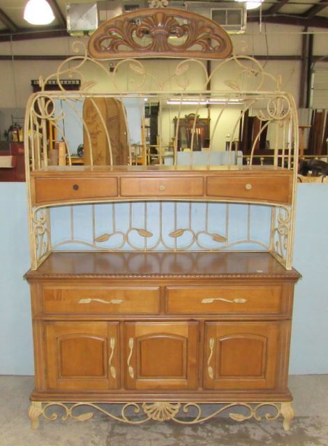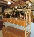 Metal base and top buffet, drawers, doors, distressed painted metal, two piece, 85"h., 52"w. Metal base and top buffet, drawers, doors, distressed painted metal, two piece, 85"h., 52"w.