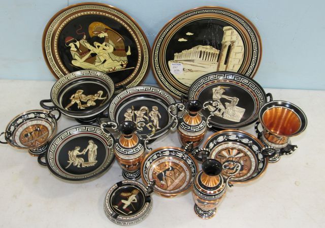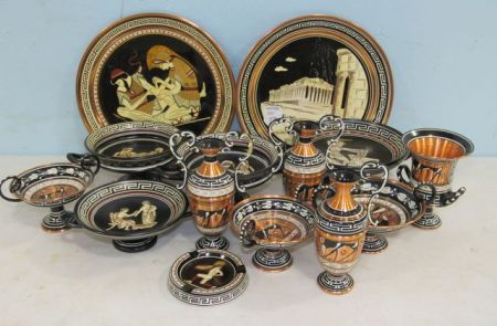 Painted black with Grecian figures, Urns, cups, vases, compotes, plate, ashtray. Painted black with Grecian figures, Urns, cups, vases, compotes, plate, ashtray.