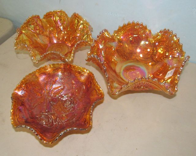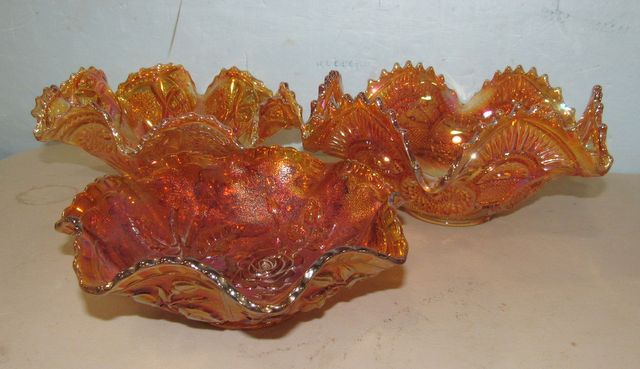 Hobstar and arches, carnival merigold bowls 9"dia., 5"h. Hobstar and arches, carnival merigold bowls 9"dia., 5"h.