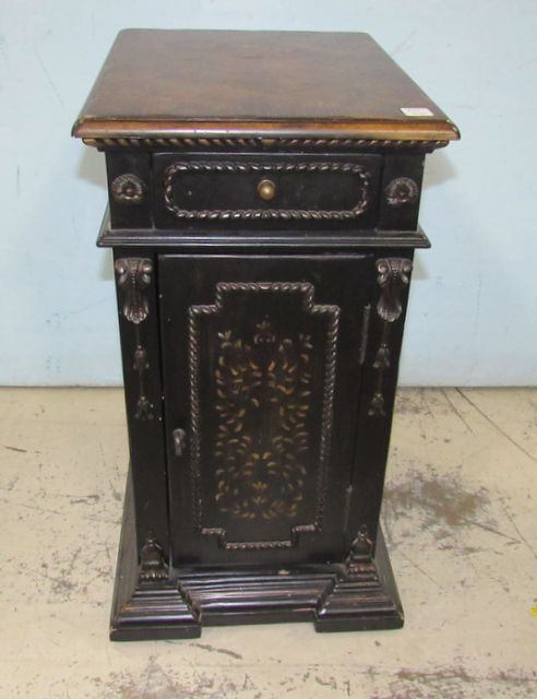Black painted base with wood top, one drawer, one door, 24"h.,13"w. Black painted base with wood top, one drawer, one door, 24"h.,13"w.