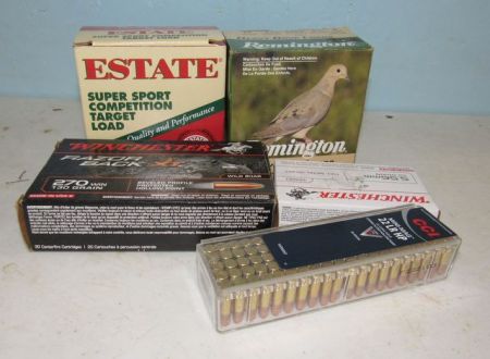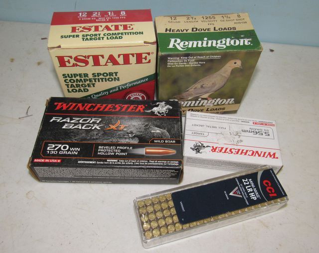 12 ga. Estate 8 shot, Remington Dove loads 12 ga., CCI 22lr hp, Winchester Razor back xt 270 win., 130 grain, Winchester 5.56mm full metal jacket 55 grain. 12 ga. Estate 8 shot, Remington Dove loads 12 ga., CCI 22lr hp, Winchester Razor back xt 270 win., 130 grain, Winchester 5.56mm full metal jacket 55 grain.