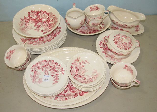 England, Two platters, gravy boat, sugar, creamer, seven cups, two salad bowls, serving bowl, serving dish, eight saucers, eight dessert plates, eight dinner plates. England, Two platters, gravy boat, sugar, creamer, seven cups, two salad bowls, serving bowl, serving dish, eight saucers, eight dessert plates, eight dinner plates.
