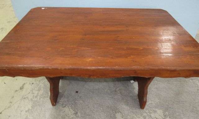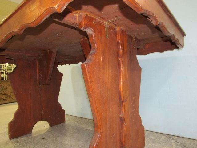 Has wear, thin wood construction, double pedestal, no leaves, 30"h, 59"w. Has wear, thin wood construction, double pedestal, no leaves, 30"h, 59"w.