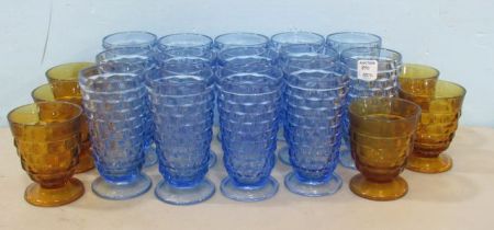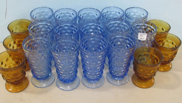 Fourteen light blue glasses and six amber white hall glasses. Fourteen light blue glasses and six amber white hall glasses.