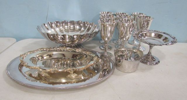 Eight Reed & Barton "Jamestown" goblets, Gorham covered dish, Reed & Barton compote, Poole dish, Reed & Barton Dish. Eight Reed & Barton "Jamestown" goblets, Gorham covered dish, Reed & Barton compote, Poole dish, Reed & Barton Dish.