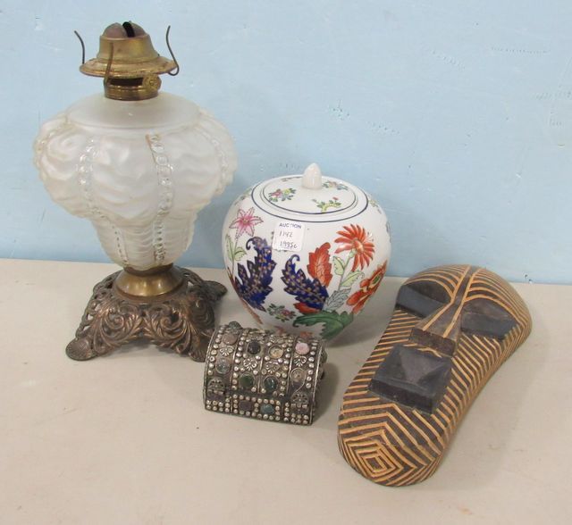 Frosted glass hurricane lamp, trinket box, carved tribal mask, hand painted ginger jar. Frosted glass hurricane lamp, trinket box, carved tribal mask, hand painted ginger jar.
