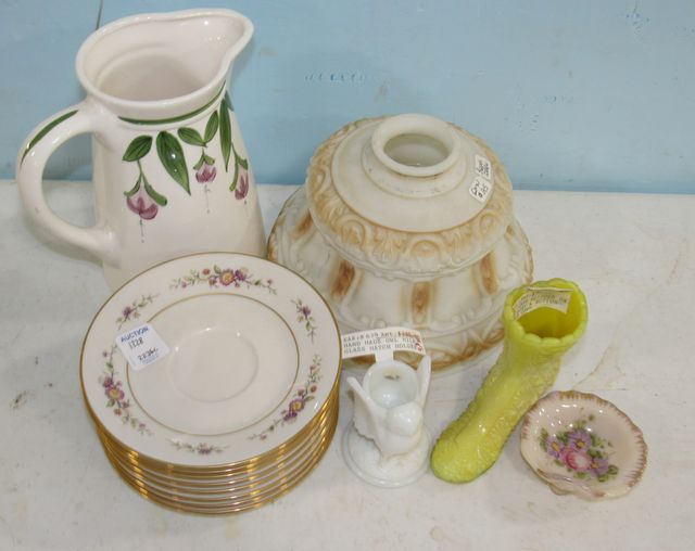 Yellow slipper in Daisy & Button, milk glass owl match holder, 3" Crown Tuscan shell dish, vintage lamp globe, pitcher, eight Noritake Ivory china. Yellow slipper in Daisy & Button, milk glass owl match holder, 3" Crown Tuscan shell dish, vintage lamp globe, pitcher, eight Noritake Ivory china.