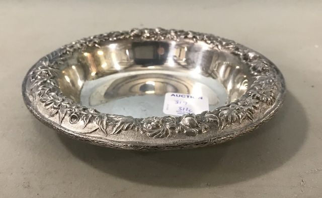 Sterling S. Kirk & Son 5 1/2" Dish, repousse, floral border. Sterling S. Kirk & Son 5 1/2" Dish, repousse, floral border.