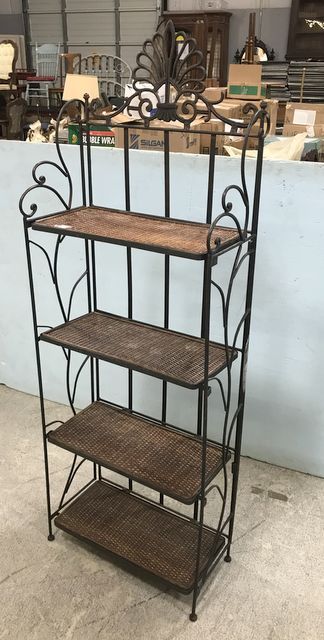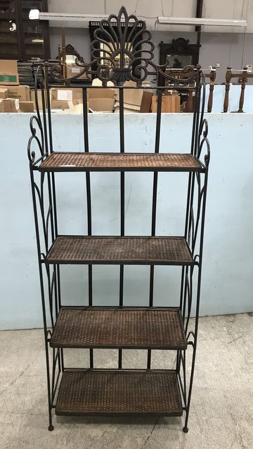 Rustic Modern Fold Out Baker's Rack, rustic metal frame, woven four shelves, 64"h., 10"d., 24"w. Rustic Modern Fold Out Baker's Rack, rustic metal frame, woven four shelves, 64"h., 10"d., 24"w.