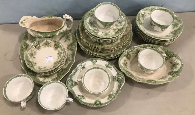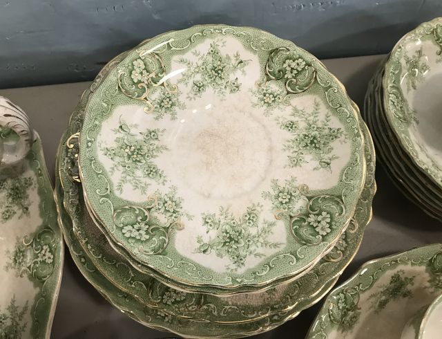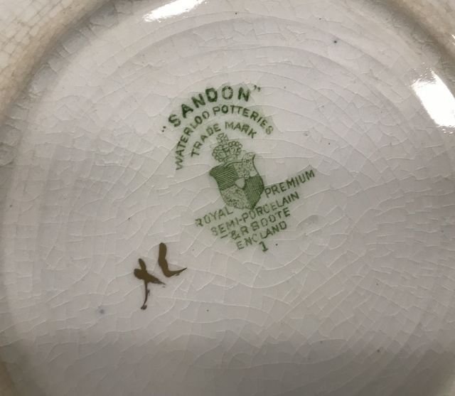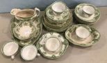 "Sandon" Waterloo Potteries China Set, semi porcelain, Royal Premium, England, 6 dinner plates, 6 salad plates, 6 berry bowls, 6 serving bowls, platter, gravy, 6 saucers and cups, serving dish. "Sandon" Waterloo Potteries China Set, semi porcelain, Royal Premium, England, 6 dinner plates, 6 salad plates, 6 berry bowls, 6 serving bowls, platter, gravy, 6 saucers and cups, serving dish.